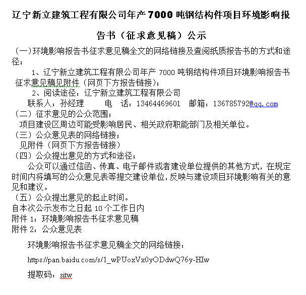 遼寧新立建筑工程有限公司年產7000噸鋼結構件項目環(huán)境影響報告書(征求意見稿)公示